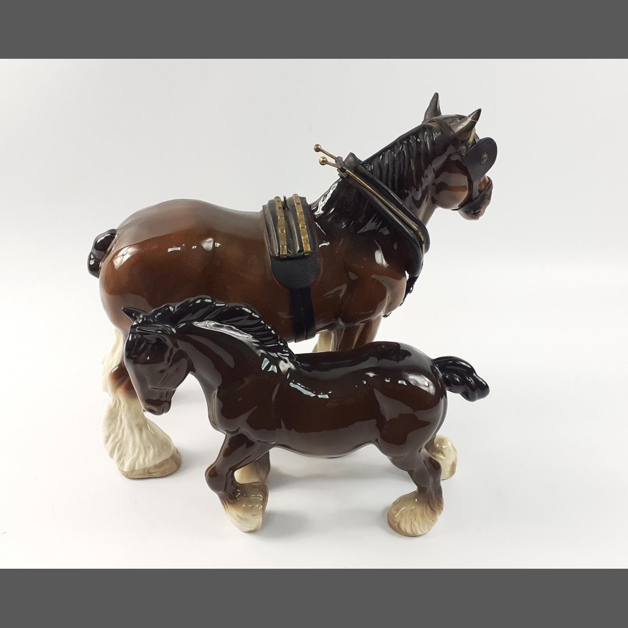 Two ceramic heavy horses one complete with leather bridle and saddle stands 28cm tall, the other is 18cm high
