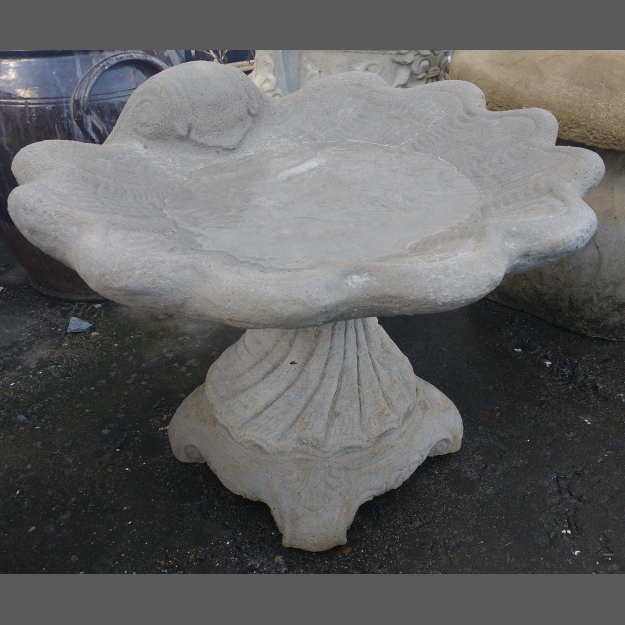 Shell topped bird bath on decorative base