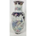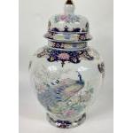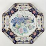 A top quality group of Japanese ceramics with a white background and a gorgeous blue peacock with iridescent gold highlights, including a ginger jar (22cm tall), a vase (21cm) and a 6 sided plate (27cm)