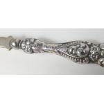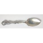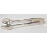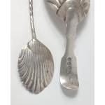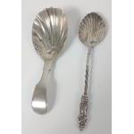 Two silver hallmarked scallop shape spoons plus a pair of silver tongs and a grapefruit spoon with silver handle gross weight 62g