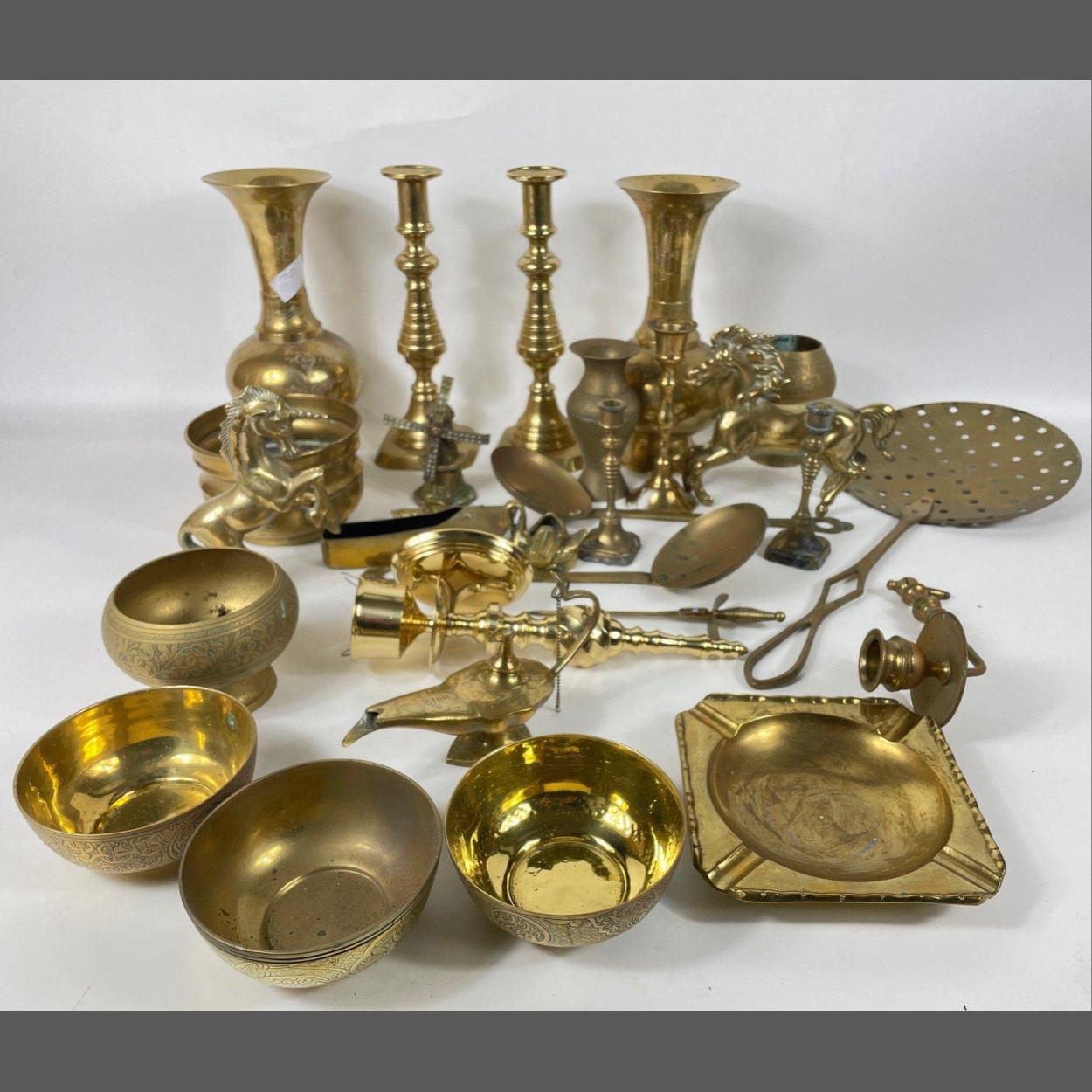 A box FULL of brassware to include a pair of ANTIQUE push-up candlesticks and so much more!!
