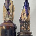 An old tin to include mainly ballpoint pens and two fountain pens with 14ct gold nibs, artists thick black pencils with some retracting lead pencils etc