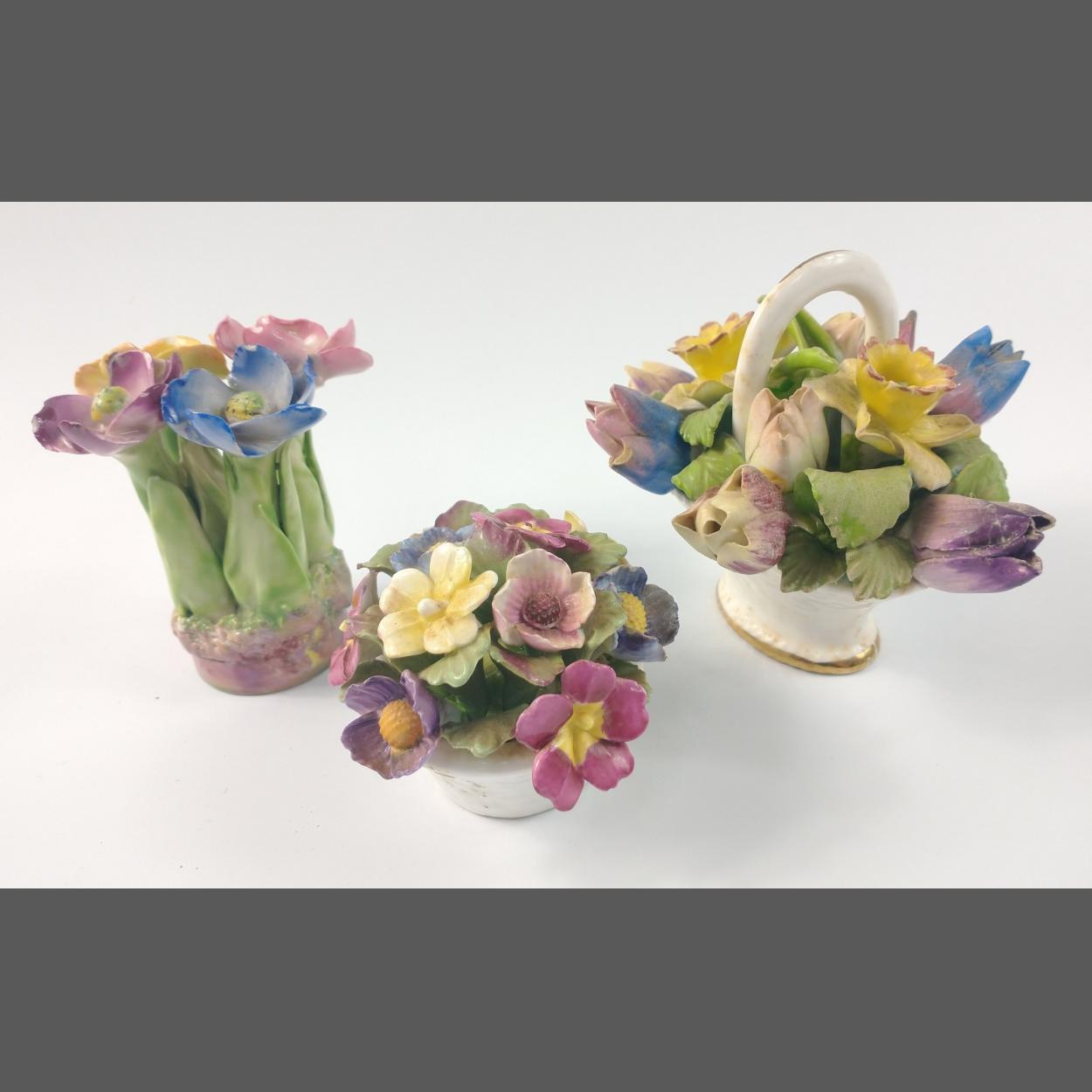 Three vintage china flower arrnagements to include AYNSLEY 7cm ( acouple of unobtrusive chips), an ARISTOCRAT FLORALS basket 11cm high (no visible chips or damage) and a group of 4 long-stemmed flowers (a few very tiny chips)