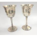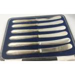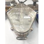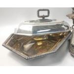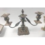 A Sheffield three light candelabra standing 23cm high, a presentation box of 6 butter knives, a pair of WALKER & HALL vegetable dishes, lids have detachable handles 28x20cm, a diamond shaped hors d'oeuvres dish with 5 glass dish (17cm long), a pair of white metal goblets 14cm tall