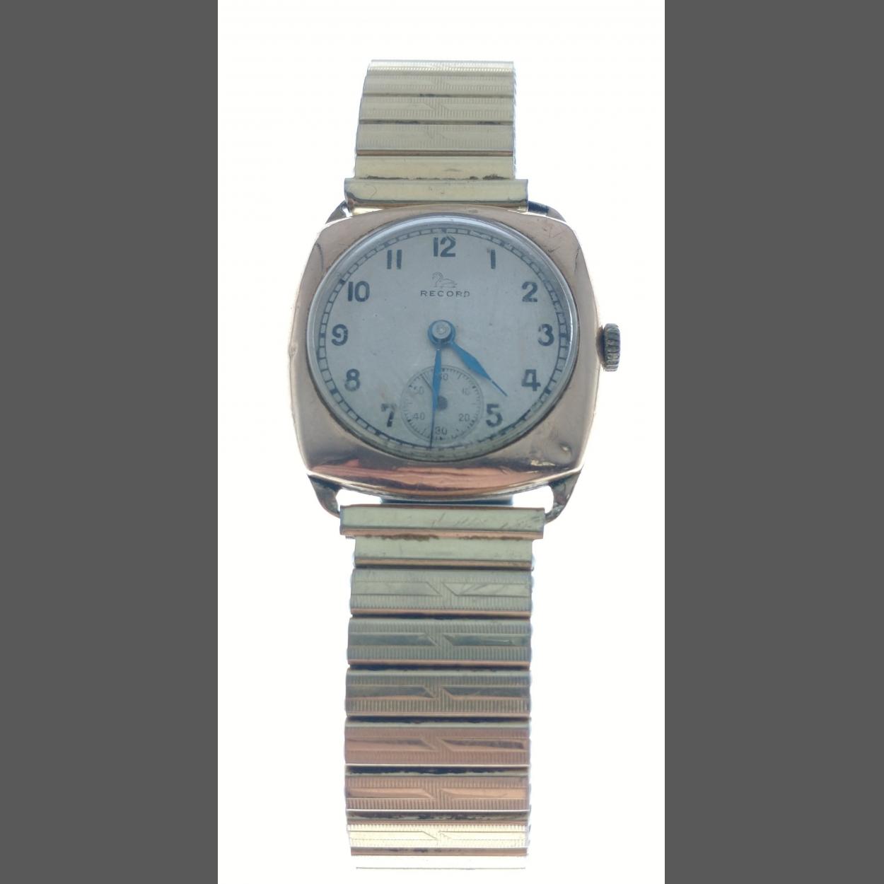 A 375 stamped yellow gold RECORD vintage gents wristwatch, the bracelet is base metal - the watch is in working order ticking away quite happily on valuation - 49g gross