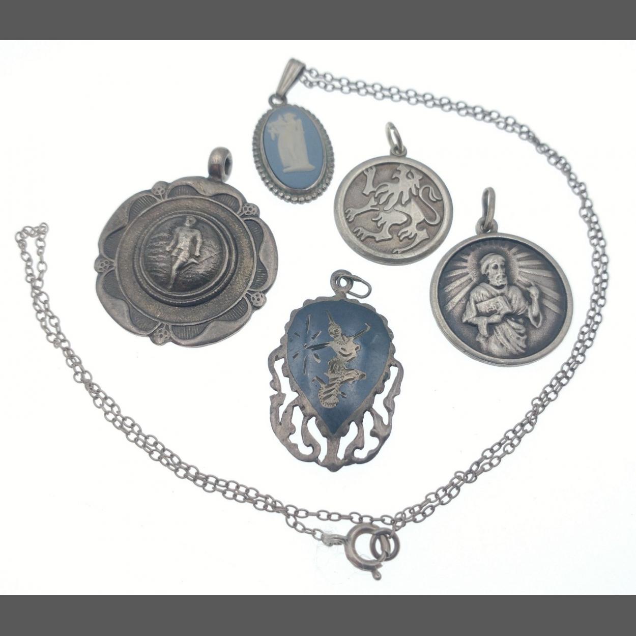 Three stamped pieces of SILVER and also a white metal pendant, three pieces of silver to include a Lion Rampant pendant 3.29g approx and also a 1961 running medal weight 8.06g approx with also a small pendant weight 1.65g gross approx and lastly a PRETTY Silver Hallmarked Cameo style Jasperware pendant gross weight 3.03g approx