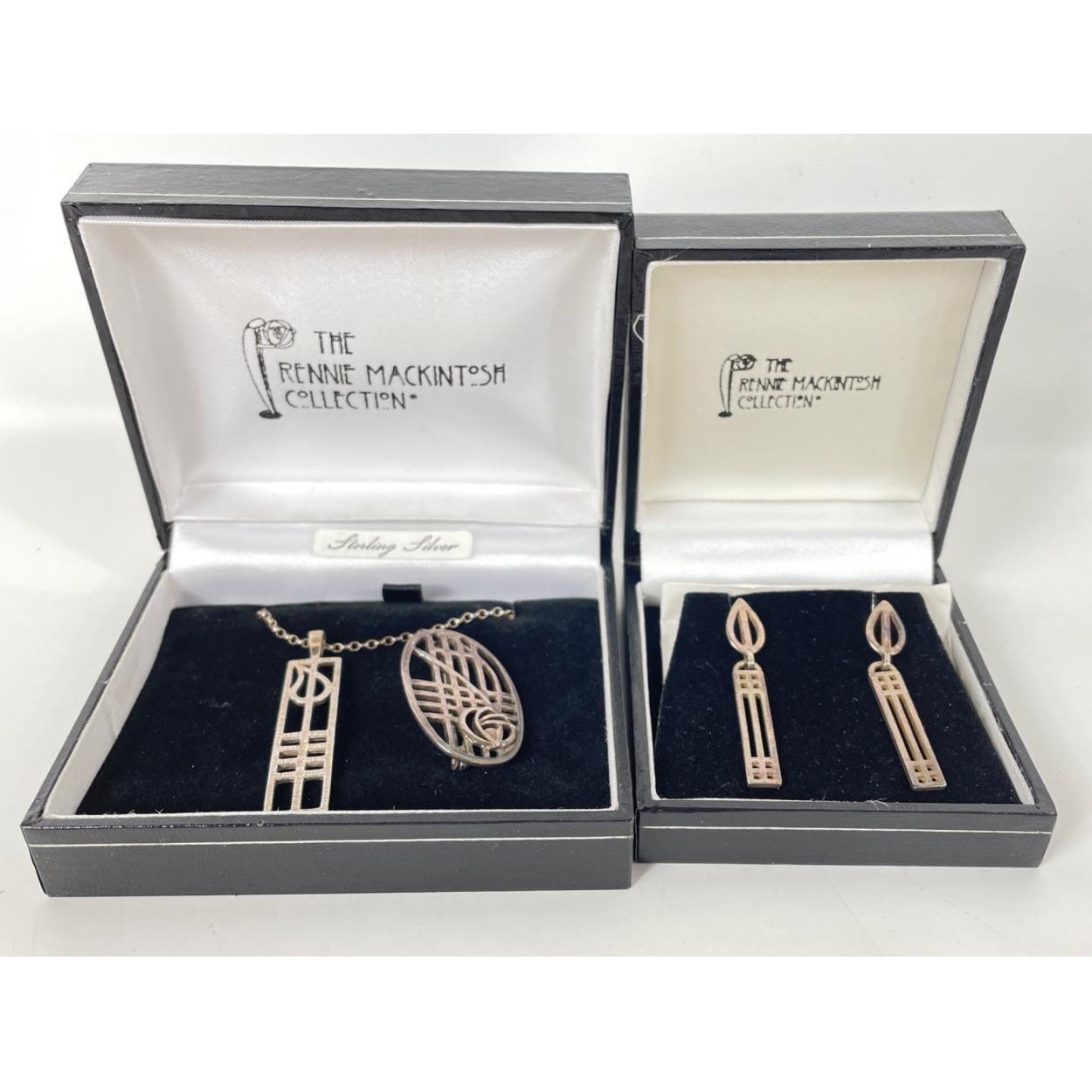 Two box sets of sterling silver The RENNIE MACKINTOSH COLLECTION to contain a pendant with a chain and also earrings set and another unmarked brooch