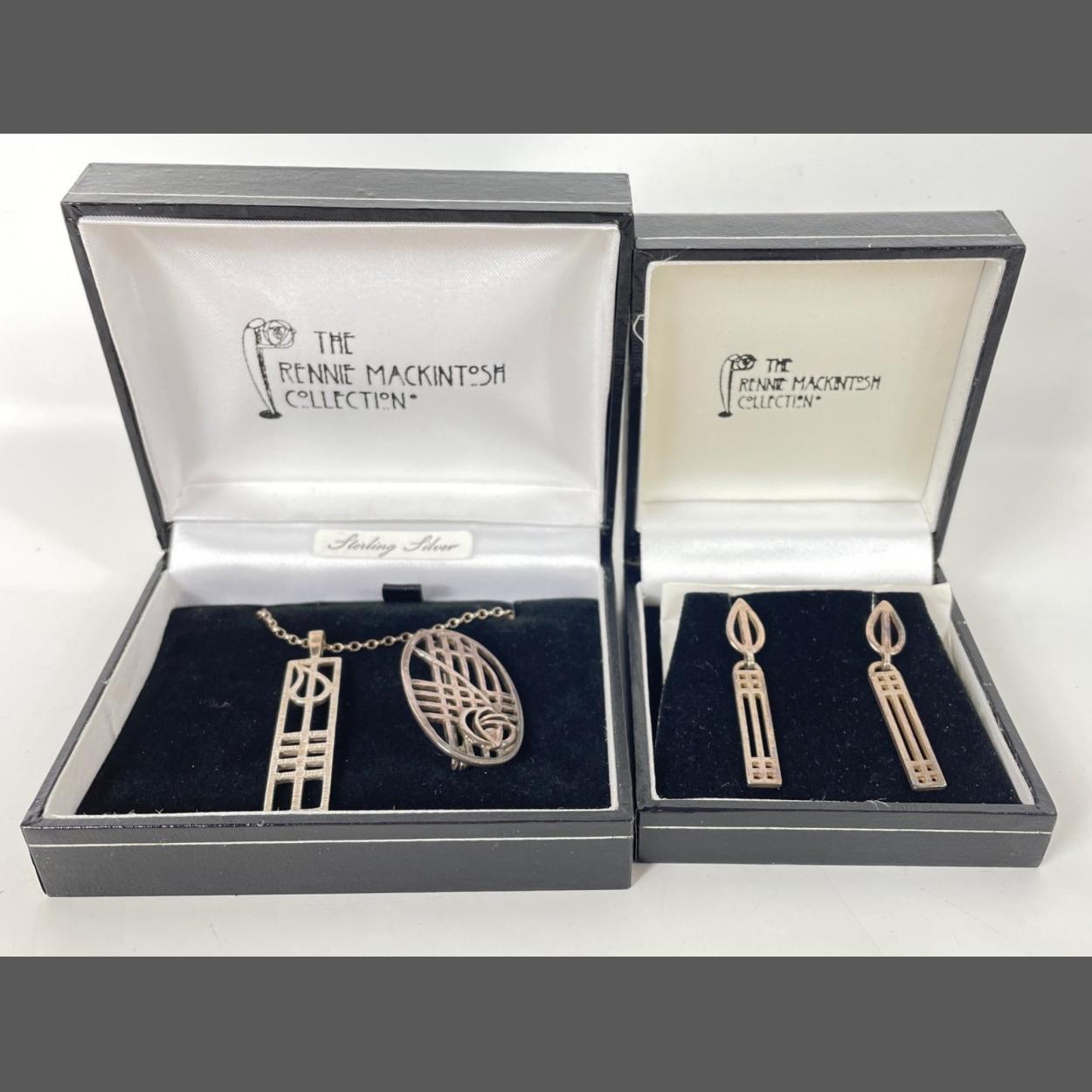Two box sets of sterling silver The RENNIE MACKINTOSH COLLECTION to contain a pendant with a chain and also earrings set and another unmarked brooch