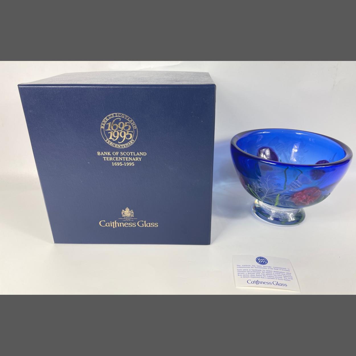A stunning piece of CAITHNESS GLASS commissioned to celebrate the tercentenary of the Bank of Scotland stands 15cm high, diameter21cm. Further info: Each piece is handmade by skilled glassmakers using centuries old techniques. Set against a cobalt blue background, a delicate pink rose pattern has been fashioned from molten glass during the making process. The bowl is deeply engraved with a garland of Scots thistles. Comes in original lined and padded presentation box