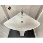 A nice corner ceramic sink with mixer tap and pedastal - in new condition unused - dimensions 46cm width x 46cm depth and pedastal height is 70cm approx New price £295!