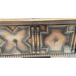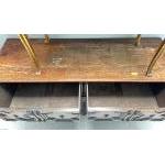 An ANTIQUE OAK STRETCHERED cabinet with two DEEP carved panelled drawers -and barley twist front supports 4.5ft long x 48cm deep x 88cm height approx