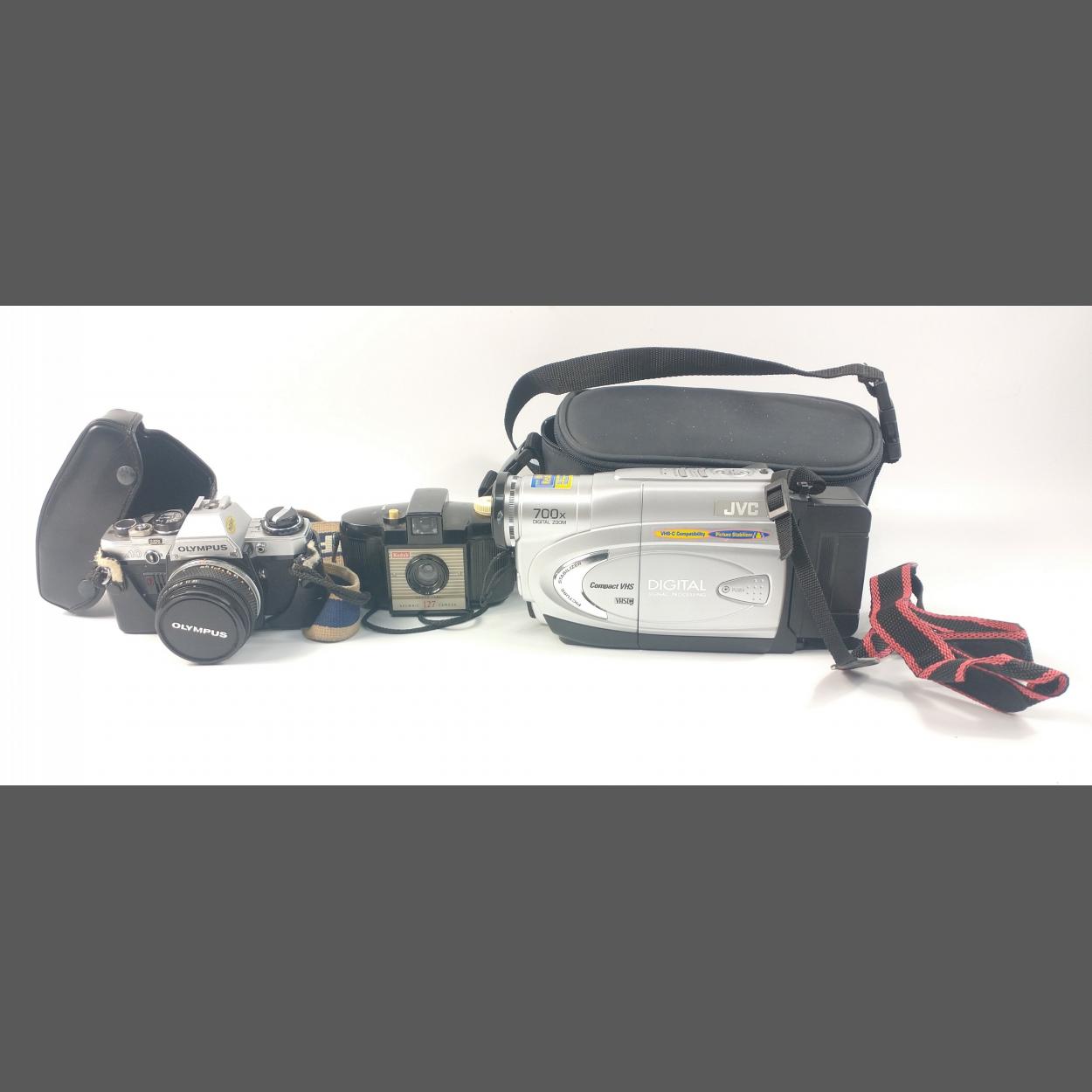An OLYMPUS OM10 camera with a Zuiko auto-S 50mm 1:1,8 lens and carrying case, plus a KODAK Brownie 127 camera and a JVC GR-FX16EK video camera with accessories and carrying case
