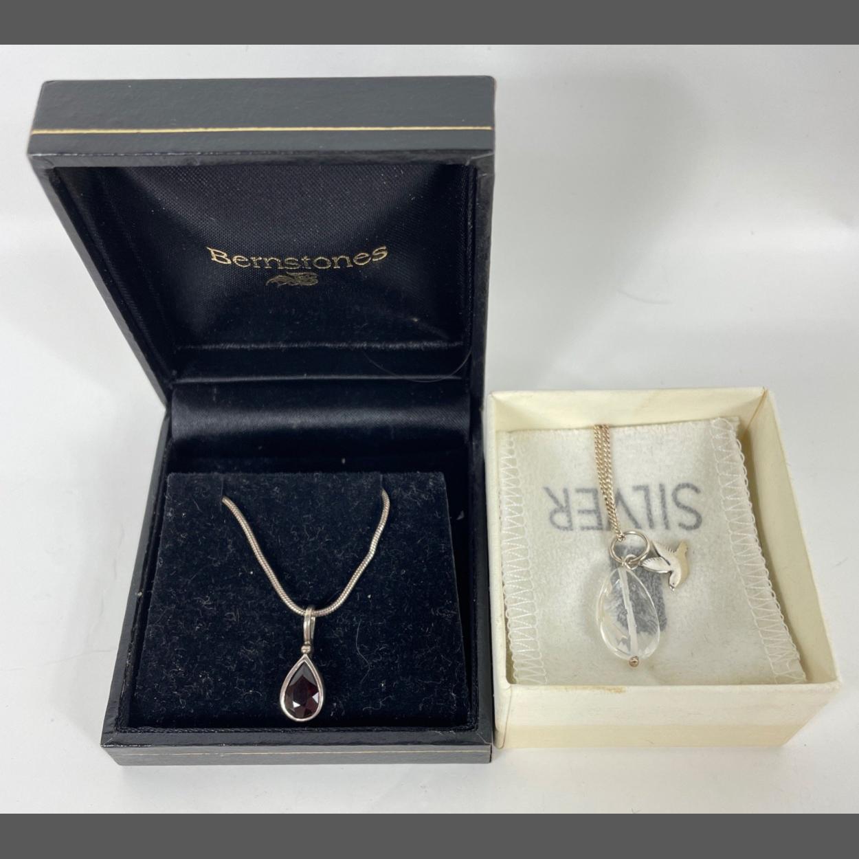 A delicate boxed 925 stamped 'SIMPLY SILVER' silver pendant with chain with a charming crystal droplet - gross weight 3.93g, with also a boxed 925 stamped pendant with chain garnet style red tear-drop stone gross weight 5.80g approx