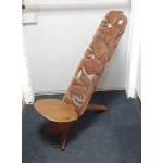 Interesting South East African wooden CHIEFTAINS/BIRTHING CHAIR carved with stylised lions. Small older label on rear reads ''The African Collection, Fountain of Knowledge. A collection of manmade crafts carved by the Artists of Africa, Malawi. Lovely item in two pieces. Back stands approx 42"