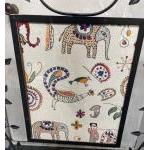 A large wrought iron effect fire screen with a decorative artistic centre panel depicting decorative and colourful animals - dimensions 72cm x 104cm height