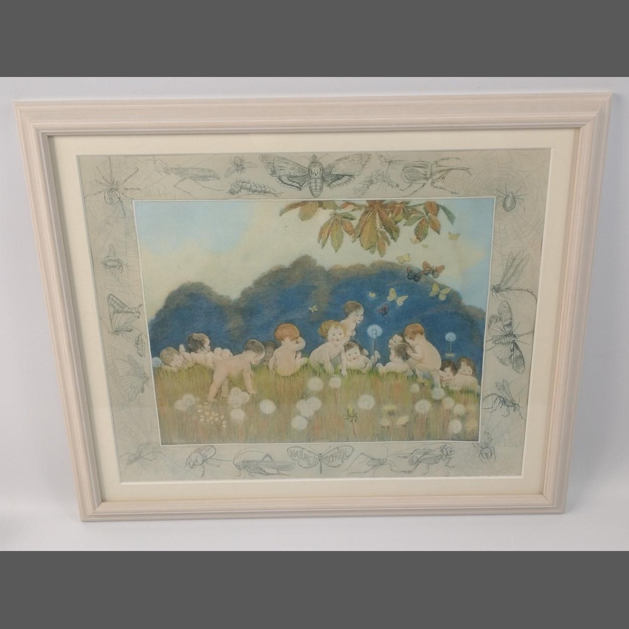 After BEATRICE PEARSE, engraved by FRED MILLAR and signed by the latter to the margin, a COLOURED ETCHING, Babies at Play with Dandelions and Butterflies, 46x38cm approx (vintage - framed by Doig, Wilson & Wheatley of George St, Edinburgh 'Picture Framers to His Majesty the King'