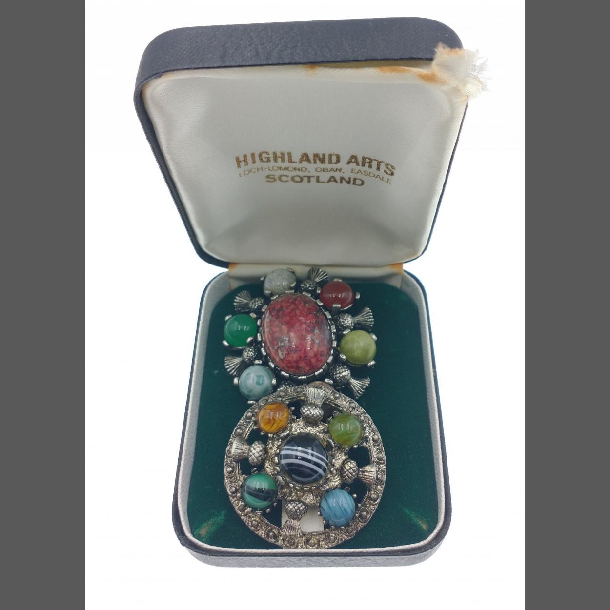 Two vintage SCOTTISH inspired brooches with thistles and semi-precious stones, 1 round (4cm dia) and 1 oval (5cm length)