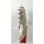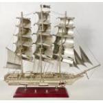 A white metal model of a 3-masted sailing ship in full sail standing 46cm high on a wooden base