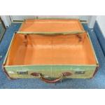 A vintage khaki canvas army issue suitcase with robust leather handle and corner protectors 70Wx39Dx22Hcm