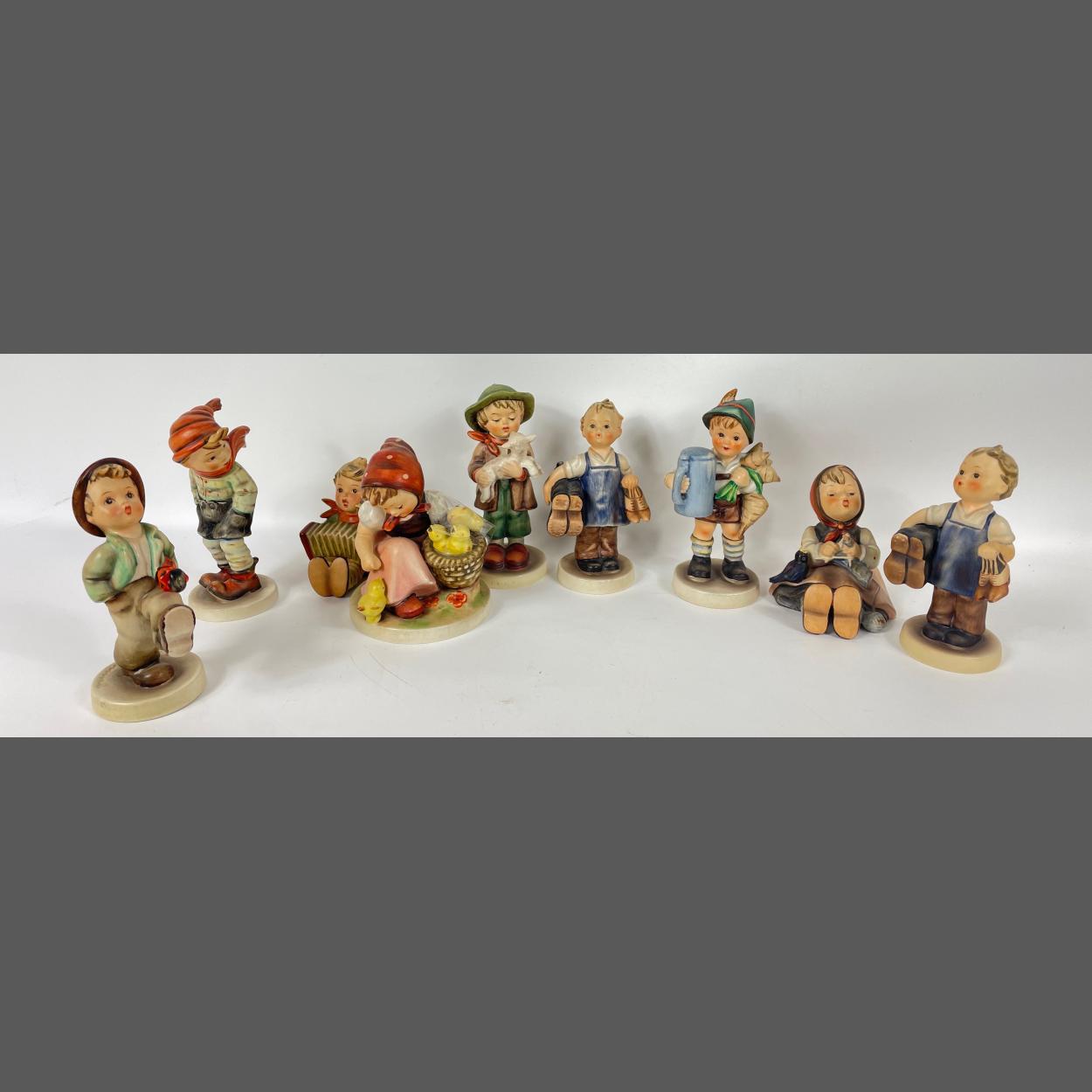 A collection of HUMMEL figures to include nos 43, 139/0, 68/0, 69, 87, 143/0 (x2), 193/8, 37/1 each approx 14cm