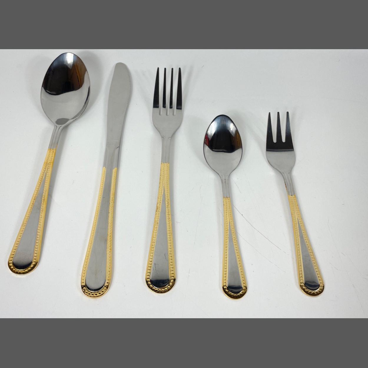 A BRAND NEW stainless steel with gold plated trim 6 place setting cutlery, knives, cake forks spoons, forks and teaspoons - all in their wrappers brand new! 30 pieces