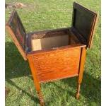 HANDY! A small sewing/hobby table with flip-top hinged lids on barley twist legs - dimensions 75cm x width 48cm x 39cm depth approx