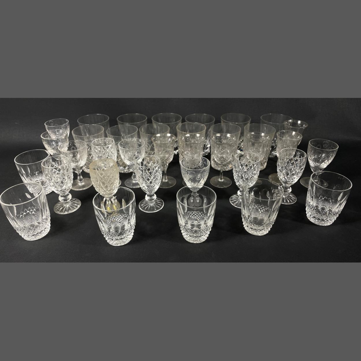 A box of various sets of 6 crystal whisky tumblers and small wine glasses, 3 sets of tumblers and 4 sets of sherry/small wine glasses