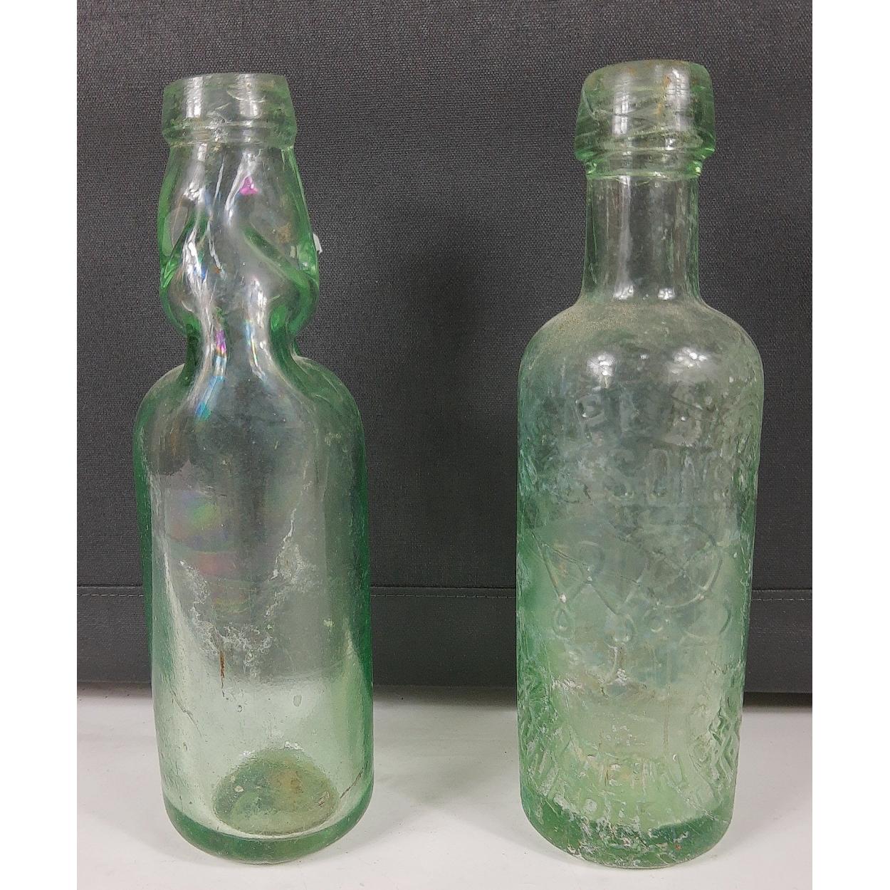 Local interest - Two glass pop bottles - one by WM PEARCE & SONS, WHITEINCH, INNERLEITHEN and a plain glass marble stopper bottle minus marble