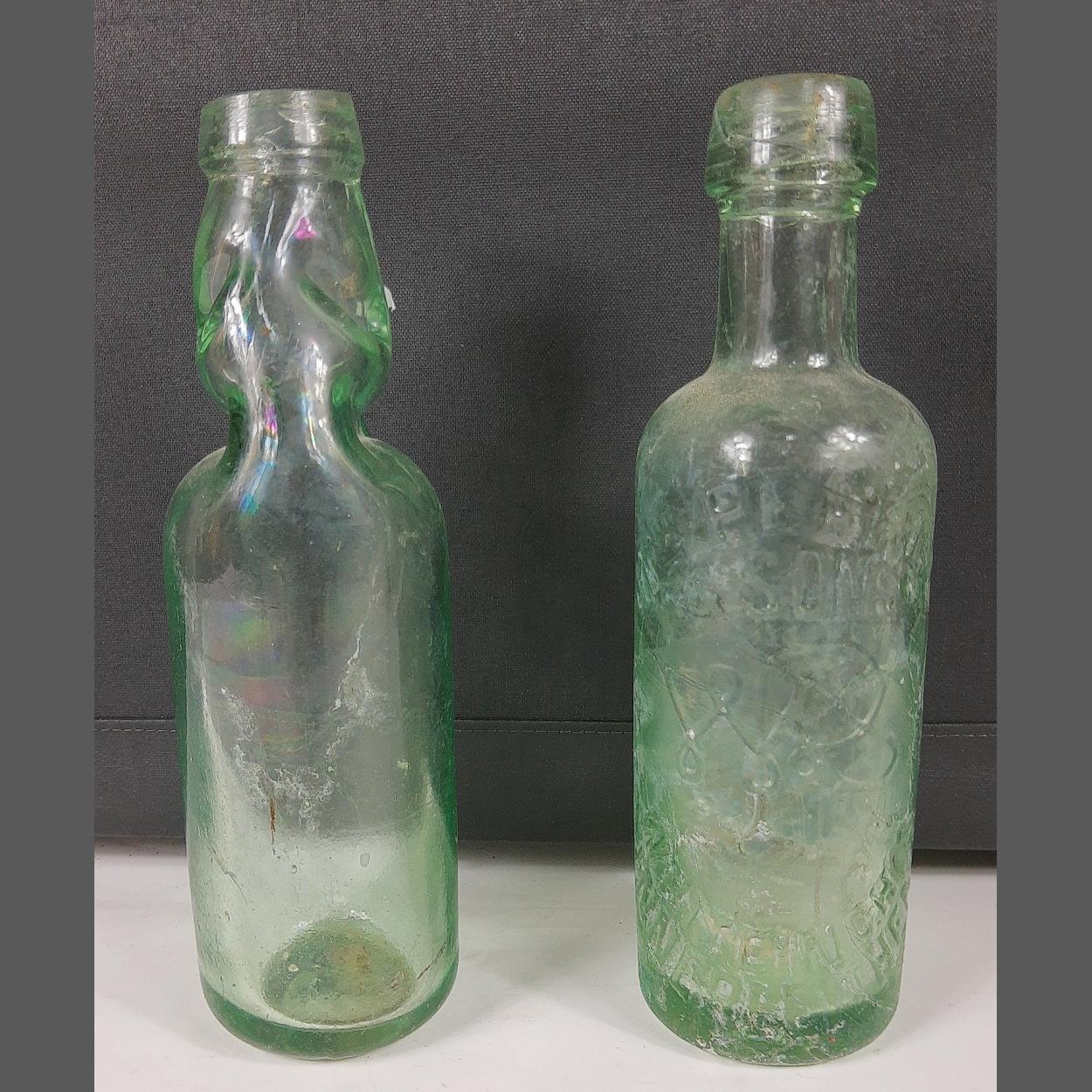 Local interest - Two glass pop bottles - one by WM PEARCE & SONS, WHITEINCH, INNERLEITHEN and a plain glass marble stopper bottle minus marble