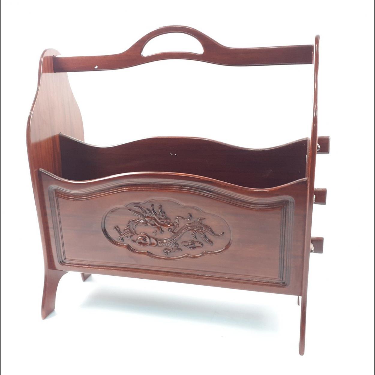 A nice quality wooden magazine rack with a dragon motif to front and back 45x19x50cmH