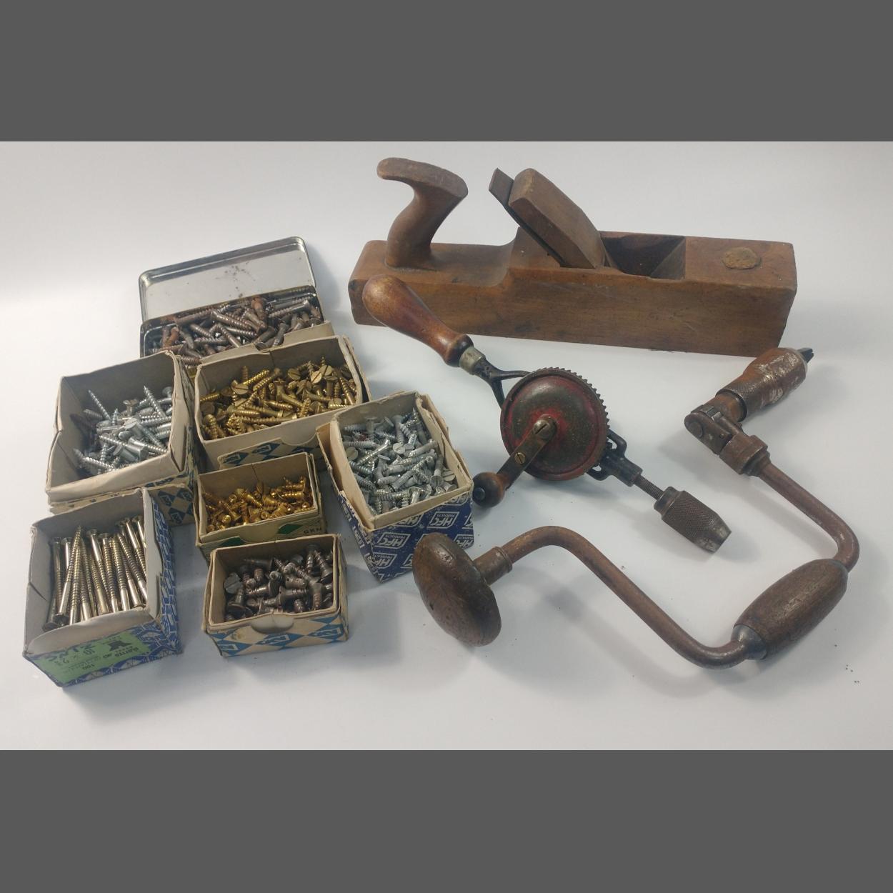 A small box of wooden carpentry hand-tools including a plane, drill plus 7 boxes screws of varying sizes (all imperial sizes) including 10x1.25, 12x1.5, 10x2.75, 14x0.75 etc