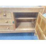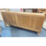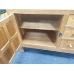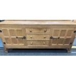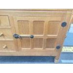 MAGICAL - MOUSEMAN (Robert Thomson of Kilburn) SIDEBOARD (W: 185cm H: 82cm D: 47cm approx) with three drawers flanked by two panelled door cupboards on turned legs with the signature hand carved mouse on the table leg - this Sideboard was part of a further MATCHING Mouseman dining suite to include 8 chairs, a tall corner cabinet and a large circular table