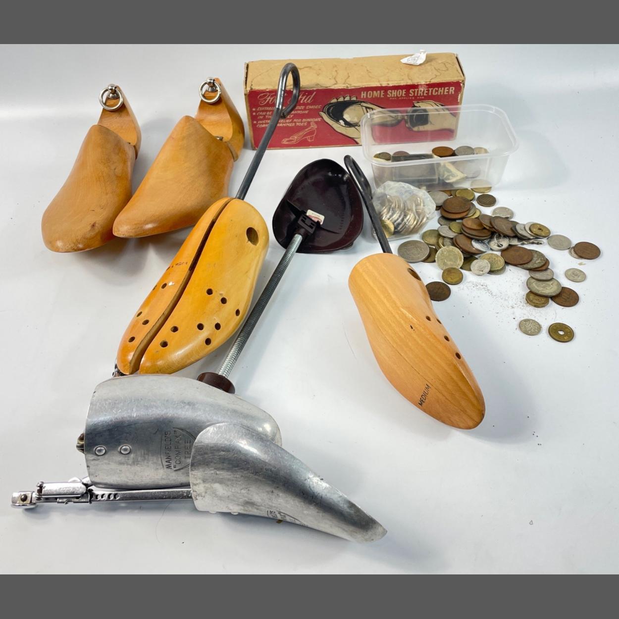 A mixed box to include a boxed cordless glue gun complete with 8 glue sticks, a boxed CLARKE soldering gun kit (Model CSK100), and a boxed POWERCRAFT glue gun and accessories, a box of shoe stretchers in various sizes and a Vintage FOOT AID HOME SHOE STRETCHER complete with box and Instructions, plus a collection of old coinage both UK and continental