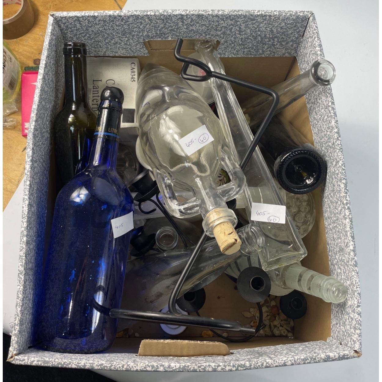 A quantity of narrow glass bottles all ready for a craft project plus candle holders etc