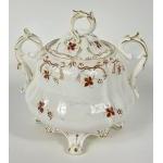 A vintage boat-shaped wooden spices box length 14cm, height 8cm, an white metal incense burner set with blue stones 10cm tall, and an ornate twin-handled lidded sugar bowl standing 18cm high