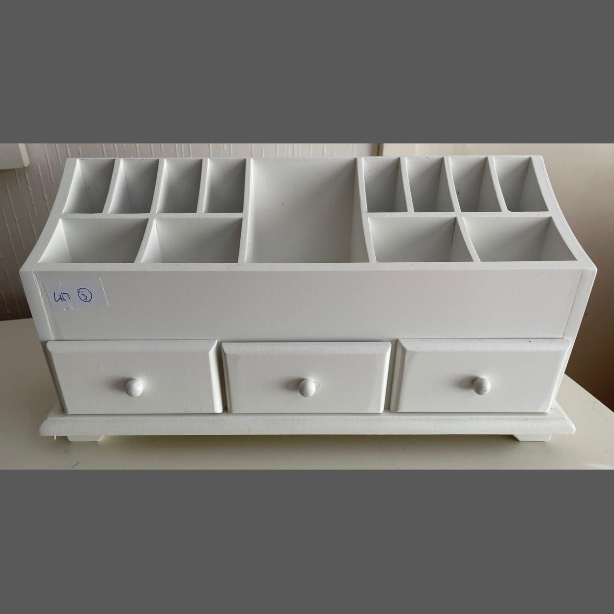 A small white desk or dressing table tidy-storage with three small drawers - - dimensions 50cm long x 13cm depth x 20cm height
