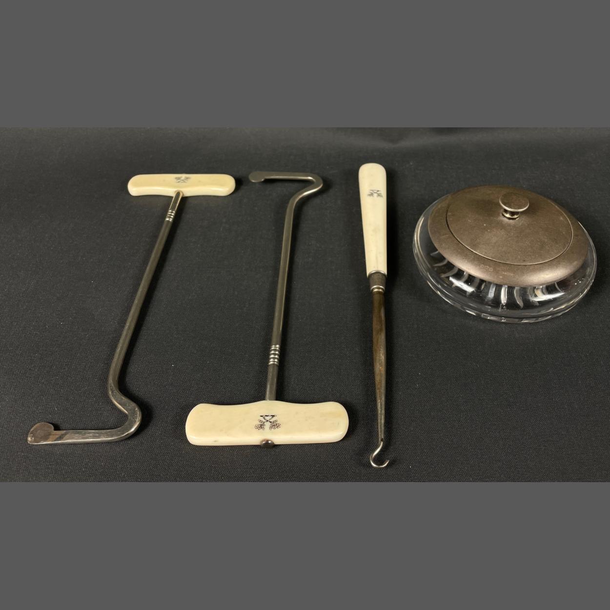 A glass powder bowl (12cm dia approx) with a mirror attached to the hallmarked silver lid (Birmingham 1947) gross weight of lid 84g, a silver (London 1904) collared button hook (25cm long) gross weight 81g and a pair of dressing aids 23cm long