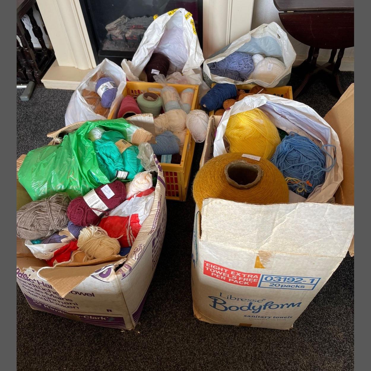 A HUGE lot with two yellow boxes FILLED with balls of wool and woollen products/ yarn cones etc and 2 large boxes also with three carrier bags FULL of wool etc