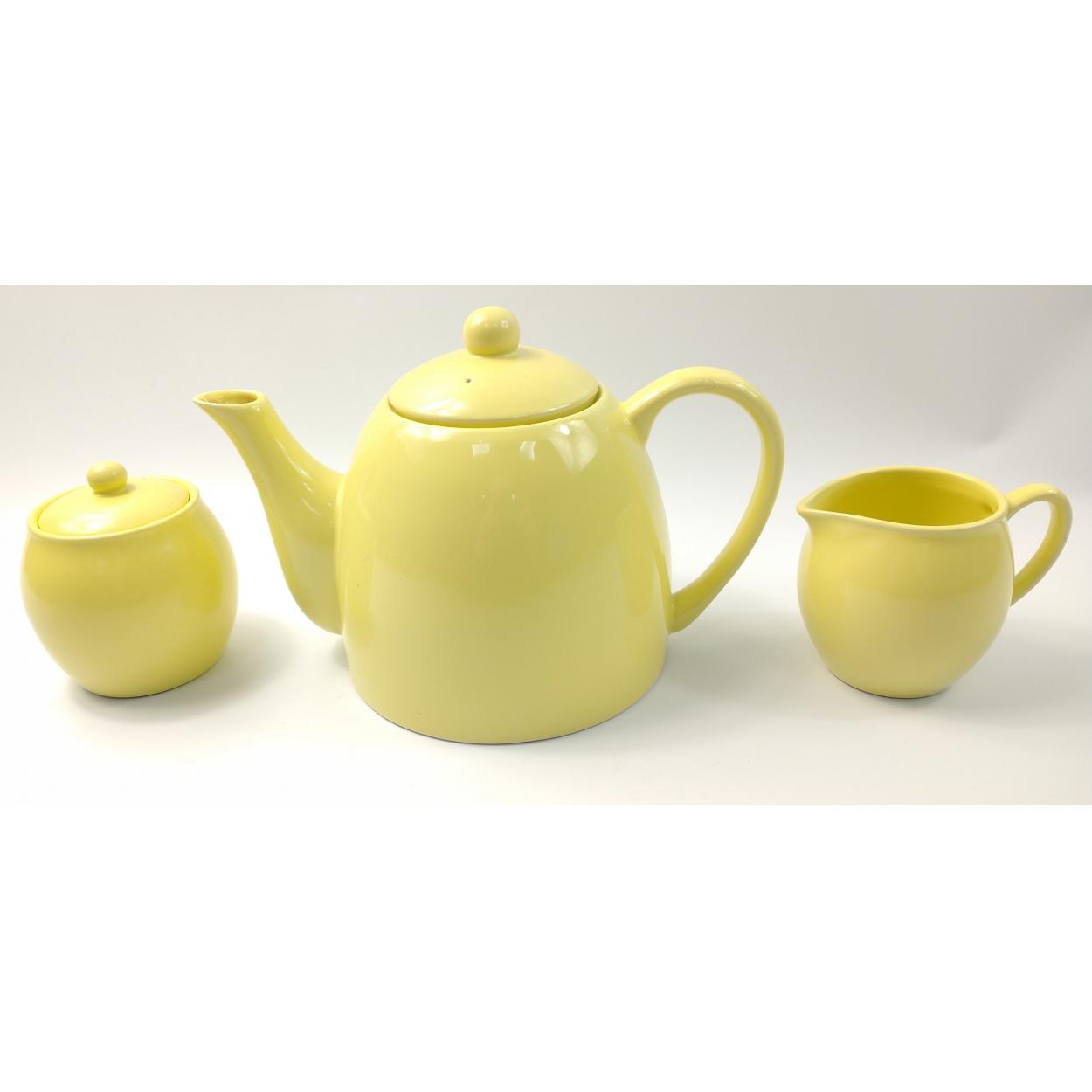 A cheerful yellow teapot for the early mornings by RAYWARE complete with milk jug and lidded sugar bowl