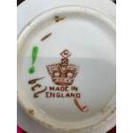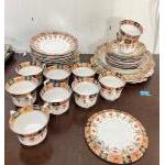 An Imari tea service possibly by Alfred Meakin comprising 10 cups (3 with cracks), 9 saucers, 14 plates, 1 bowl (23cm with some crazing), 2 sandwich plates and a teapot stand