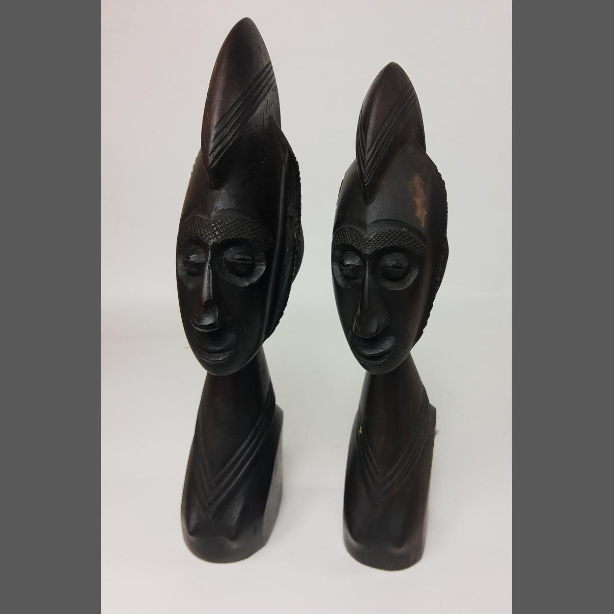A pair of wooden stylised head and shoulder busts, surprisingly heavy for their size 32 and 30cm high