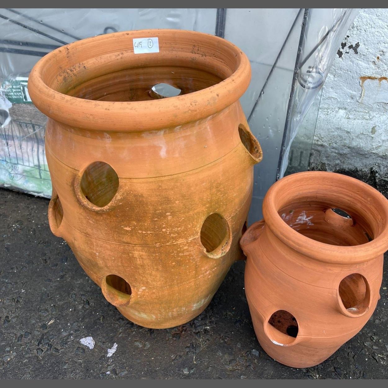 A TERRACOTTA LOT - two terracotta planters suitable for either strawberries or herbs or even some trailing annuals - larger one height 46cm and the smaller one height 30cm approx