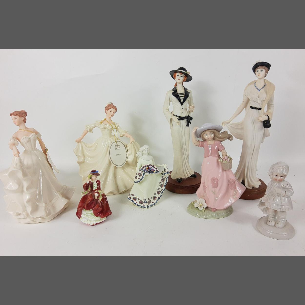 From the LEONARDO COLLECTION 'Simone' and 'Nicola' each standing 23cm high, a ROYAL DOULTON 'Top O'The Hill (HN3499) girl standing 10cm tall, a girl with a basket of flowers (part of arm missing (20cm tall), 2 tall Edwardian ladies (30cm tall), a Spanish Nadal figurine 14cm tall, etc