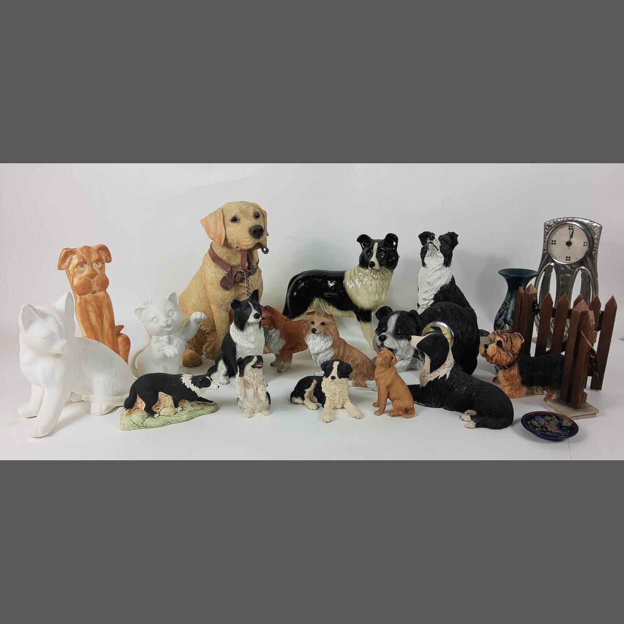 A mixed collection of canine figurines to include a Leonardo Collection DOG STUDIES Walkies! Labrador from 2008, plus collies, and rough collies etc plus 2 plaster cats,