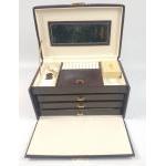 A faux leather mulberry carry jewellery case with three drawers and a fitted top shelf WITH key