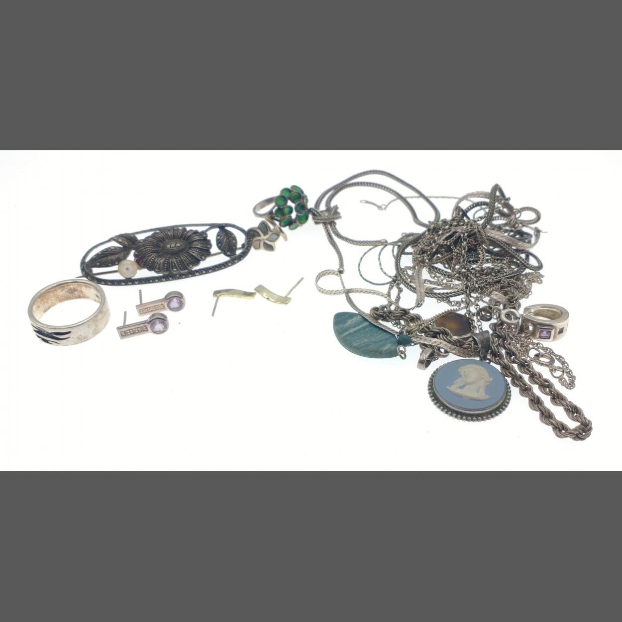A quantity of 925 marked silver to include chains, earrings and a brooch gross weight 72g