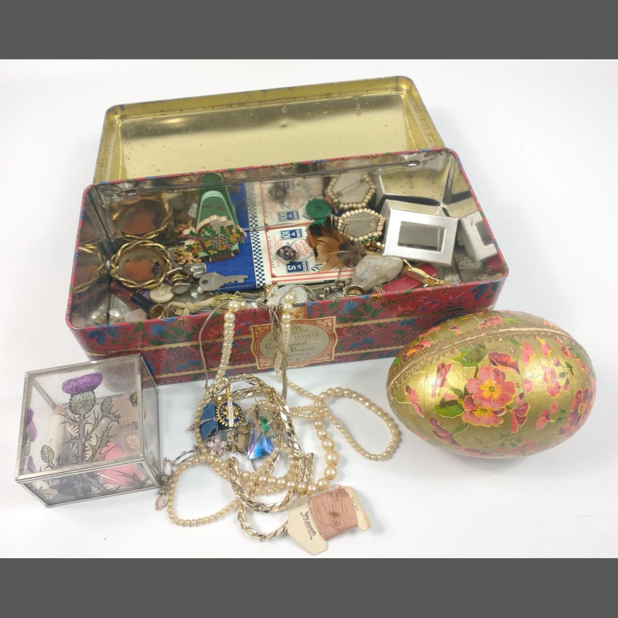 A vintage floral biscuit tin with assorted contents