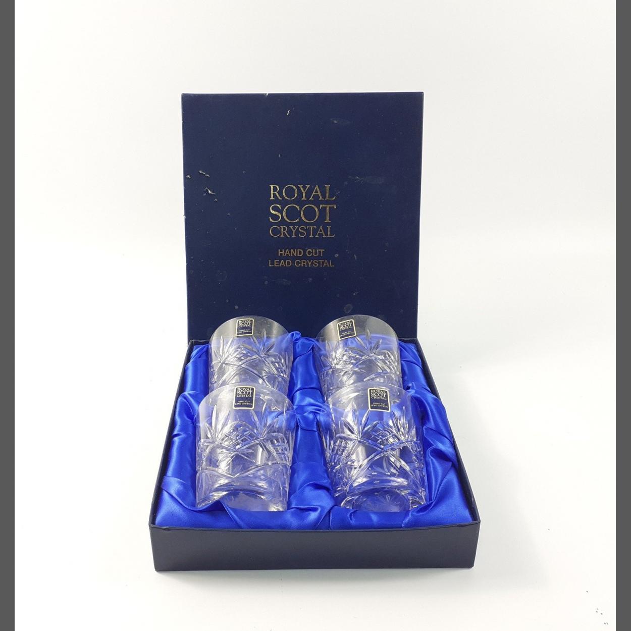 A box set of 4 ROYAL SCOT HAND CUT LEAD CRYSTAL whisky tumblers unused - still in their original presentation box! dimensions of each glass 9cm height x 8cm diameter