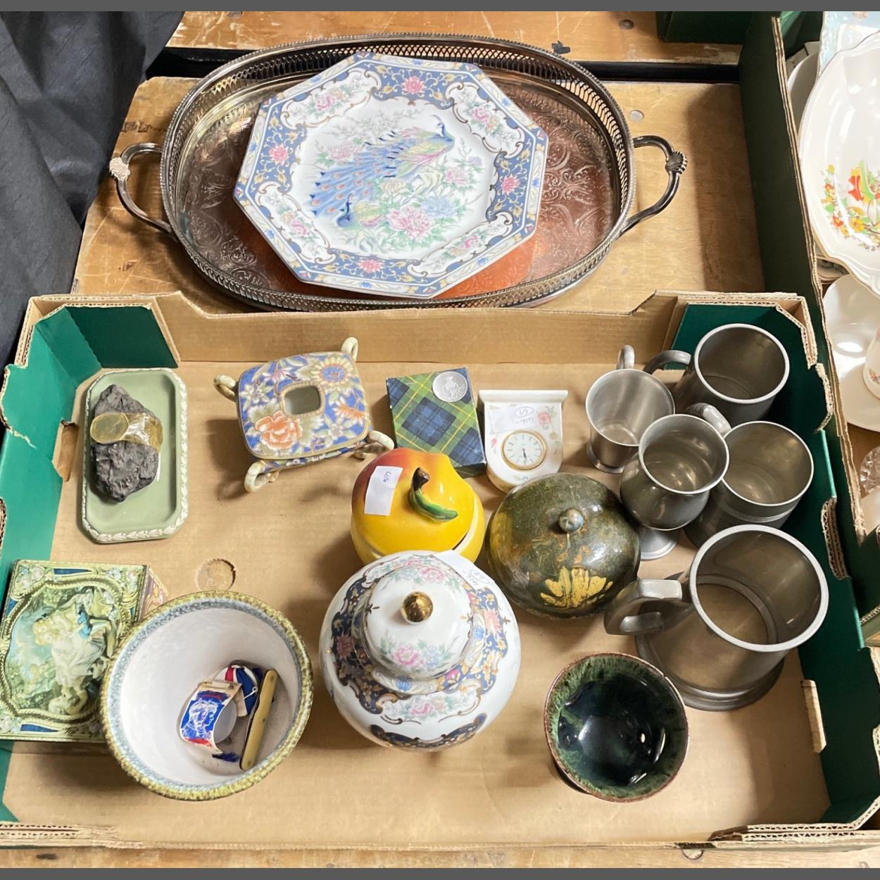 A mixed box to include a vintage CAVALIER silver plated oval gallery tray with twin handles 4 and bun feet (42cm long plus handles), 4 pewter tankards, a papier mache trinket box (12cm dia), a WEDGWOOD 'Rosehip' clock, a small box of costume jewellery (9cm high), an attractive blue and white ginger jar with a peacock (22cm high) with a matching plate (27cm dia), a vintage DENBY plant holder (13x11cm), an unusual NORITAKE incense holder (11cmW x 10cmD x 5cmH), a CARLTON WARE apple-shaped jampot (12cm tall) etc