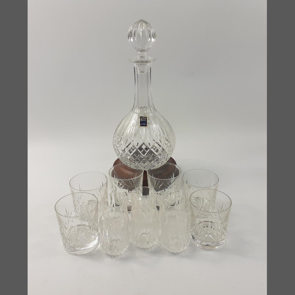 A ROYAL SCOT HAND CUT LEAD CRYSTAL decanter with stopper and wooden base to fit into - 33cm tall incl the base x 13cm wide approx with 6 small liqueur glasses 6cm tall x 4cm diameter and lastly 6 small WHISKY TUMBLERS 8cm tall x 6cm diameter - all in great condition!